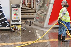 Outside the ferry terminal, the pigeons were being given a shower. Im