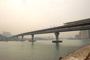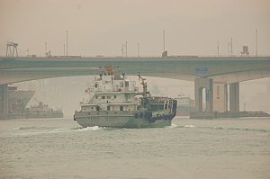bank peering out of the smog. It is an area of huge bridges and there are
