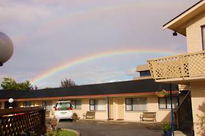 to the motel it was raining again but there was a pretty rainbow.