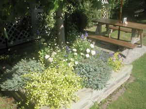 of flowers and a nice water feature.