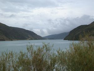 After 20 minutes drive, I stopped for a rest - I needed it - and took a couple of photos looking back down the lake towards the Clyde Dam. As I had driven out of Alexandra, there had been drizzle on the windscreen and the clouds hung low over the lake.