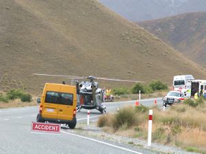 The fireman explained that there would be a considerable delay because the rescue helicopter was about to land on the road, which it soon did. It appeared that a cyclist had come down the hill too fast, lost his balance and landed on his head. His helmet had probably saved his life but only just. I chatted to the fireman - a Wellington lad who had moved down to Omarama for work and now loved it there. We were joined by an elderly American doctor, who came to offer his services and stayed to chat when he found that there was a doctor on board the helicopter. He was travelling round the country, complete with a collapsible bike in his car on which he did an hour and a half ride every morning. |