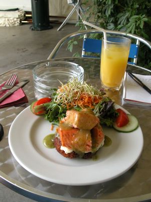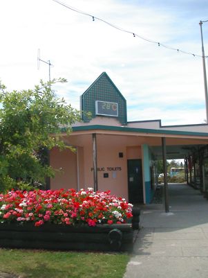 I made haste as it was lunch time, ignored Omarama, the gliding capital of New Zealand, and headed straight to Twizel, where I spent a night on my last tour. The thermometer over the public toilets showed that it was 28 so I took my usual photo - also because of the pretty flowers - and had a very nice lunch of hot-smoked salmon on a rosti.