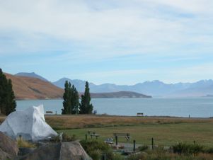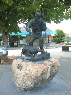 In the centre is a statue of James Mackenzie, after whom the Mackenzie country was named. He was a typical Scottish sheep stealer but exceptional in his ability to live off the inhospitable high country. He served time in jail for his exploits and then left New Zealand. What happened to him after this is not known. It is 150 years since he was captured and celebrations are being planned. |