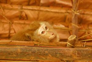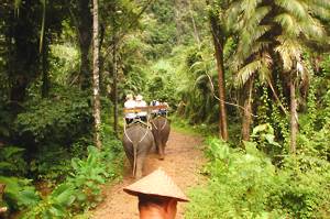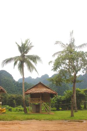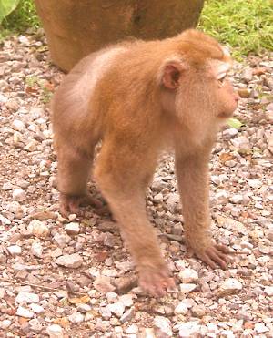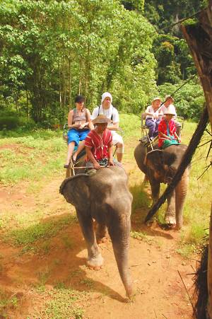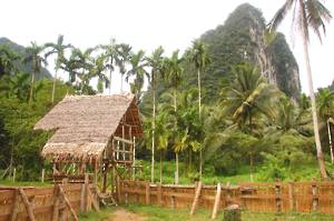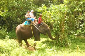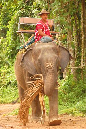 June 5th. Elephant Hills An 8.30 start. Very civilized. Breakfast wasn't very exciting, a mediocre attempt at a European style buffet. Entertainment was provided by the house monkey, which had escaped from its normal confinement. Apparently, it has a problem with cats and children and had been getting into trouble. With us it was fine and begged for food before going to sleep in the rafters.