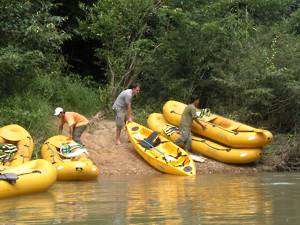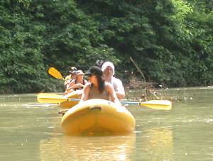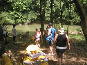 We had an hour and a half to rest before walking down the slope in front of the bar to the river, where we climbed into large canoe/rafts, each of which had a paddler seated at the rear.