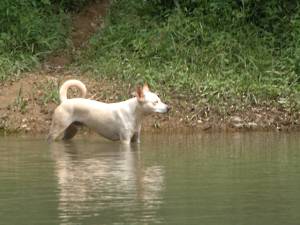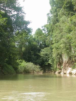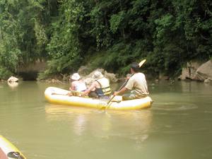 We set off slowly down the Khao Sok river, quite small and often shallow at this stage. Huge limestone cliffs towered over us, the banks were heavily wooded and the river was full of fallen branches through which we had to weave our way. The rapids were pretty gentle, the major danger appearing to be colliding with one of the other boats in the flotilla. There were a few small toads perched in a crevice half way up a cliff, a brown and yellow snake asleep up a tree, a couple of ducks and an out of focus dog. The toad and the snakes refused to be photographed - too dark to get them in focus at a reasonable shutter speed when bouncing around in a boat. Everything was quiet except for the few places where the river ran close to the main road.