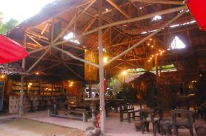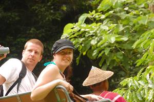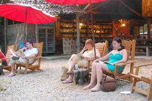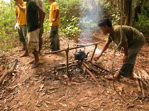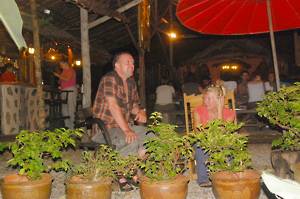 We stopped at a small clearing for tea brewed over a log fire. Swimming was offered but the brown colour of the water discouraged most of us. At this stage, my old camera, brought especially for the purpose of playing around in boats, decided to breath its last, so that the rest of the trip went unrecorded. Suffice it to say that it was all very gentle and a relaxing way to spend the afternoon. It was a shame that we didnt see more wildlife but thats the way it goes. After a couple of hours we scrambled out of the river and caught the Land Rover back home. Awaiting us was a plate of water melon & pineapple and a plate of mixed nuts, dried chillies, dried lime leaves and dried anchovies. Excellent. Hot showers - the hot water was now running - and a very cold beer followed. We sat on the terrace, drank and chatted with the other two couples on our part of the trip - and tried to ignore the French coach party which had arrived at lunchtime.