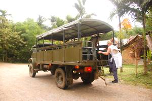We passed through a rubber plantation, the photos of which were shaken to pieces by the undulating gait of our transport. We wandered off the path into the bush in search of a light snack, returned to the track and completed a circuit of about an hour before returning to the camp. Going uphill was a bit bumpy but not otherwise unpleasant. Going downhill was decidedly painful as we were repeatedly thrown against the safety rail on the front of the seat.