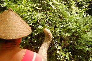 We climbed aboard and set off up a rough track. To begin with the swaying completely ruined all of my photographs but I eventually managed a few half decent ones. The factor that has to be remembered is that the mahouts have a cooperative arrangement with the elephants. The latter will work as long as they are allowed regular meal breaks. These entail plunging off the path into the bush and grabbing as much foliage as possible. After a few minutes, they can then be enticed back onto the path. Given that the elephants don't all wish to have a snack at exactly the same time, moving the caravan along at any sort of speed is difficult.