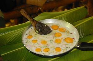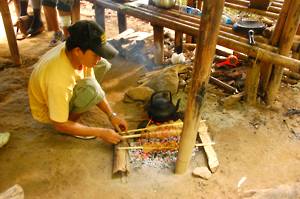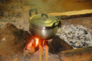 us tea and coffee in bamboo cups, the water heated over an open fire.