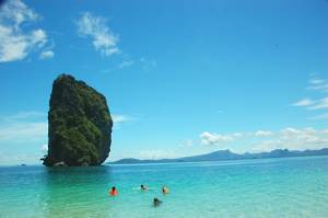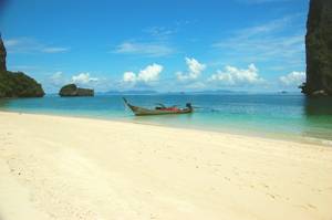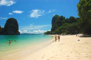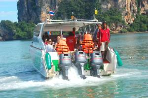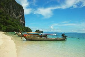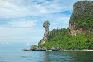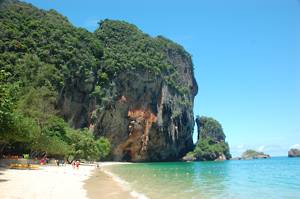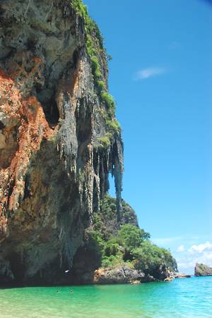 First stop was Railay Bay, just round the coast from Ao Nang and resembling an island paradise. There we collected another passenger, who waded aboard through the surf looking extremely elegant. She must have been French! Unfortunately, modesty prevented me from taking her photograph.