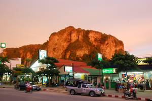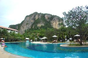 Swimming beneath these was a chastening experience as I wondered how often the huge slivers of rock fell off. The rock did provide some wonderful shade from the hot sun so that this was an excellent place in which to swim and avoid the increasing amounts of sunburn. Floating had the benefit of removing any pressure from my sore foot. We sailed back, stopping again at Railay Bay to unload a couple of passengers, returned to our point of embarkation and were then taken back to the hotel in a minibus. There we found a shower and lay on the grass by the pool while Valerie went off for a pedicure. When she returned, we wandered into town in search of some tea. They walked, I limped. I was dumped in a bar, behind a large bottle of beer, whilst the others did some final shopping. When they returned, we had some snacks - fish cakes, salads, tempura etc - and then returned to the hotel. The van was waiting for us when we arrived - 15 minutes early - so it was a rushed departure. We arrived at Krabi Airport, checked in and waited. The plane left and arrived in Bangkok on time and our van collected us, arriving at the hotel almost at midnight.