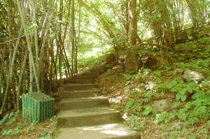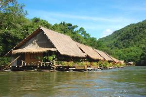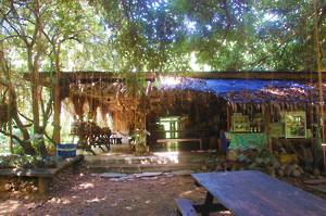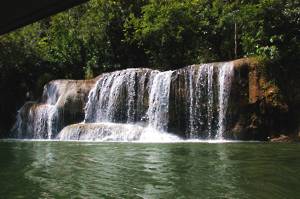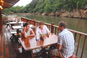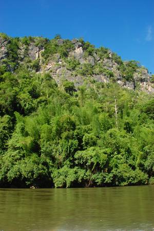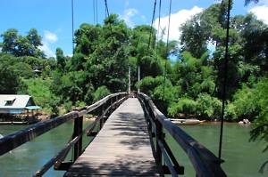 We moored alongside a floating restaurant and shop with an interesting collection of stuff. We were able to use the toilets and also to buy water in preparation for what we assumed would be a long walk. We were near to a small waterfall - the Sai Yok falls. These were far from spectacular, there being many better ones in New Zealand. In order to view these from another angle, we were marched over a very rickety suspension bridge. I managed to drag myself over, assuming that we were going somewhere interesting, only to discover that we then had to march back over it again. I and my quivering nerves were not amused.