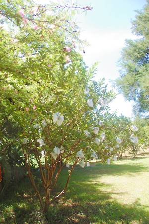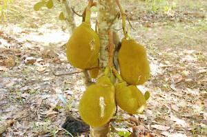 We tootled upstream for about 20 minutes and then disembarked, climbed a steep bank and arrived at a small gift shop. There we photographed the pet monkey (photo didnt work) and one of the numerous fluffy white dogs which lived there. We continued our way through an orchard, complete with fruit (probably limes) protected in small plastic bags.