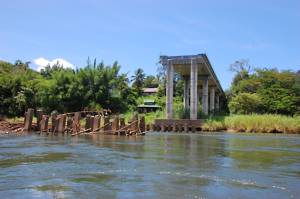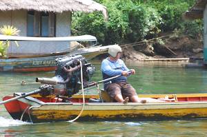 June 10. River Kwai After a very nice breakfast on the terrace, we staggered back down the steps again to the river bank, where we boarded a long-tailed boat. These seem to be the standard method of transport in Thailand (and also in Cambodia). They feature motors of varying sizes which are attached to a long pole at the end of the boat. This is the propeller shaft and the helmsman (or woman, steers the boat by heaving on the shaft to adjust the position of the propeller. They are all very noisy and some of the motors are huge, looking as if they were salvaged from a redundant jet fighter.